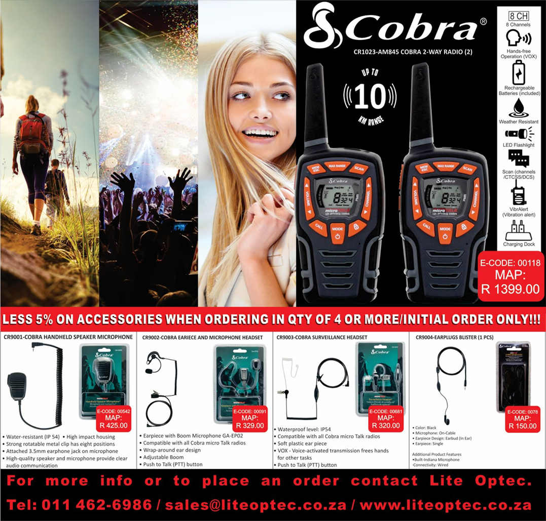 With a range of up to 10 km this Cobra walkie talkie offers excellent communication when hiking, climbing or cycling. This model is water-resistant with a built-in LED Flashlight and rubberized grips that provide enhanced functionality to keep you on the go. The VibrAlert® notifies you of incoming transmissions with enhanced vibrating feedback. Voice-activated transmission frees hands for other tasks. A total of 3124 channel combinations are available when the 22 channels are combined with the 142 privacy codes (38 CTCSS/104 DCS).