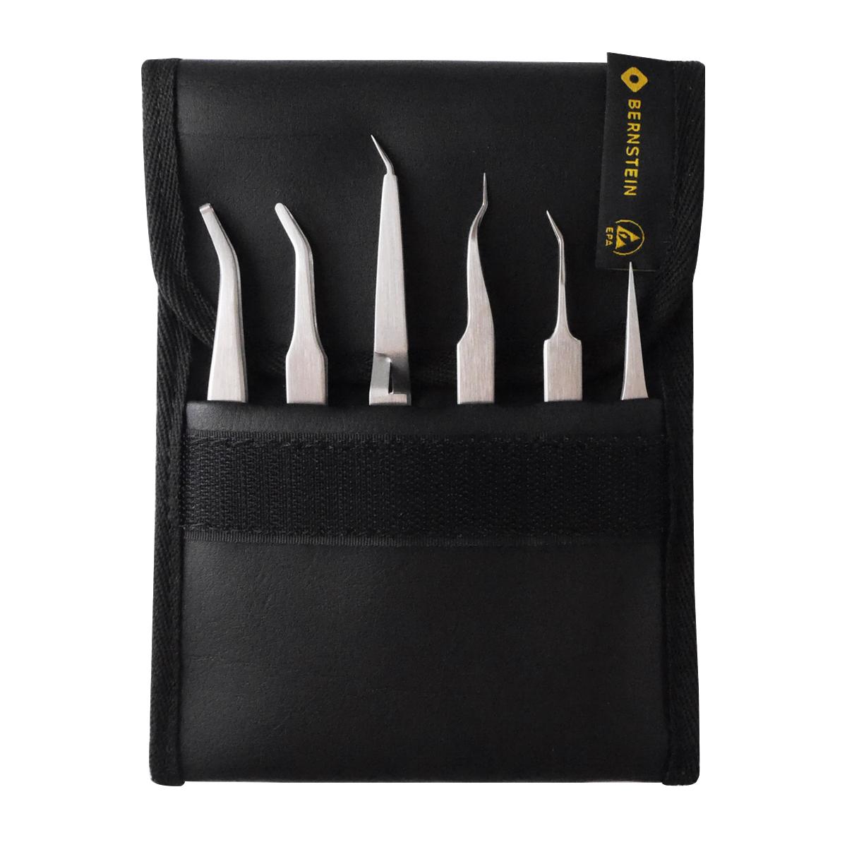 Tweezers for SMD/THT technology, for gripping parts and components such as mini MELFs, diodes, resistors or precise pick-up of filigree wires.100% stainless steel anti-magnetic, rustproof and acid-resistant, reflection-free matt fine polished. Stainless austenitic chromium nickel quality steel with low carbon content, for good corrosion resistance (not seawater resistant). Case consisting of ESD imitation leather, EPA suitable for electrostatically protected areas (ESD workplace/ESD protection zone corresponds to standard DIN EN 61340-5-1), dissipative 10^6 Ohm. The leatherette is flame retardant, biocompatible and contains a dissipative Velcro strap to prevent static charge when opening.Content: see parts listmaterial stainless steel SAstorage in a leatherette bagmeasures 130 x 140 x 20 mmweight 135 g